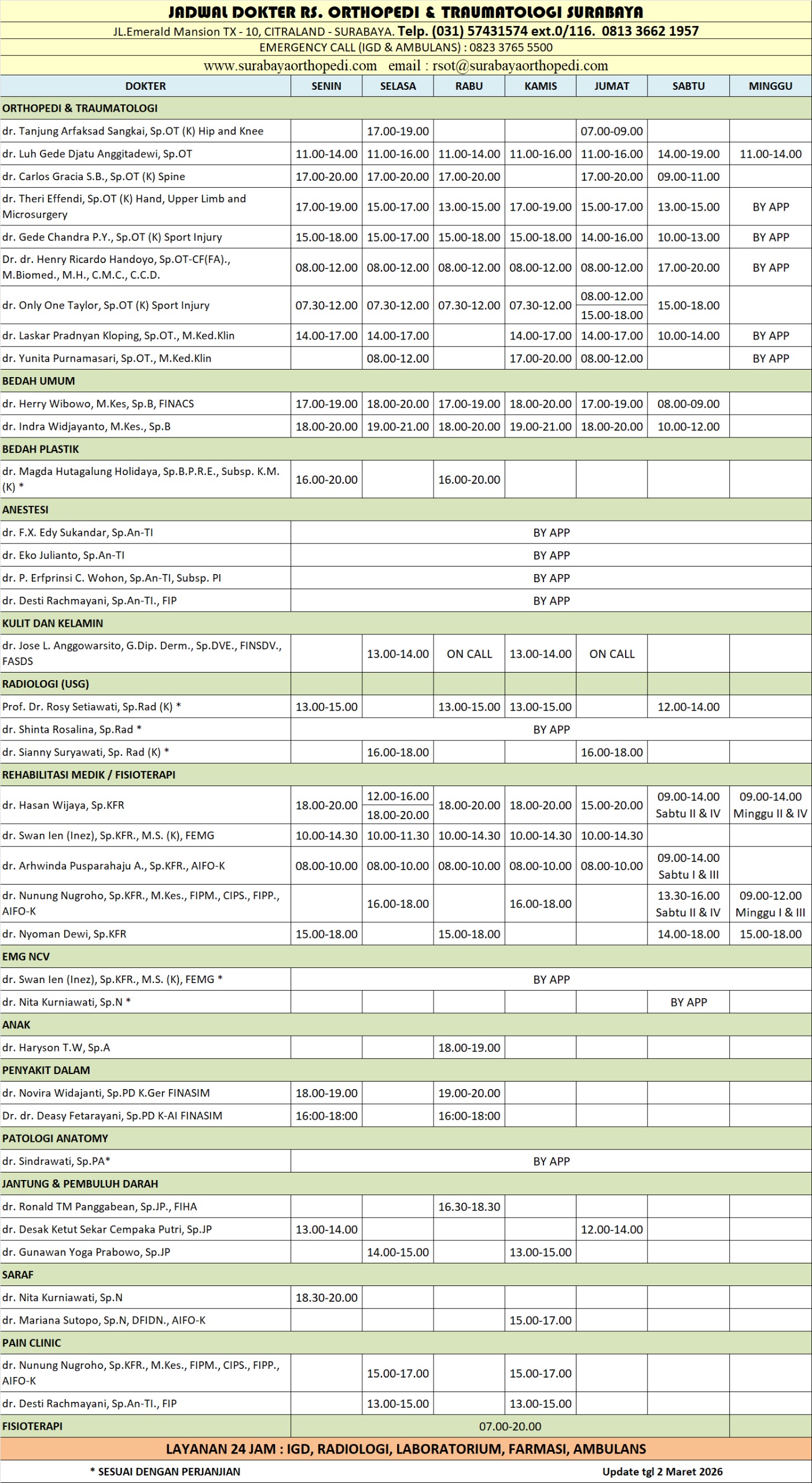 Layanan poliklinik spesialis orthopedi dan rehabilitasi medik tetap buka pada hari Minggu atau hari Libur Nasional, sesuai jadwal praktek dokter spesialis